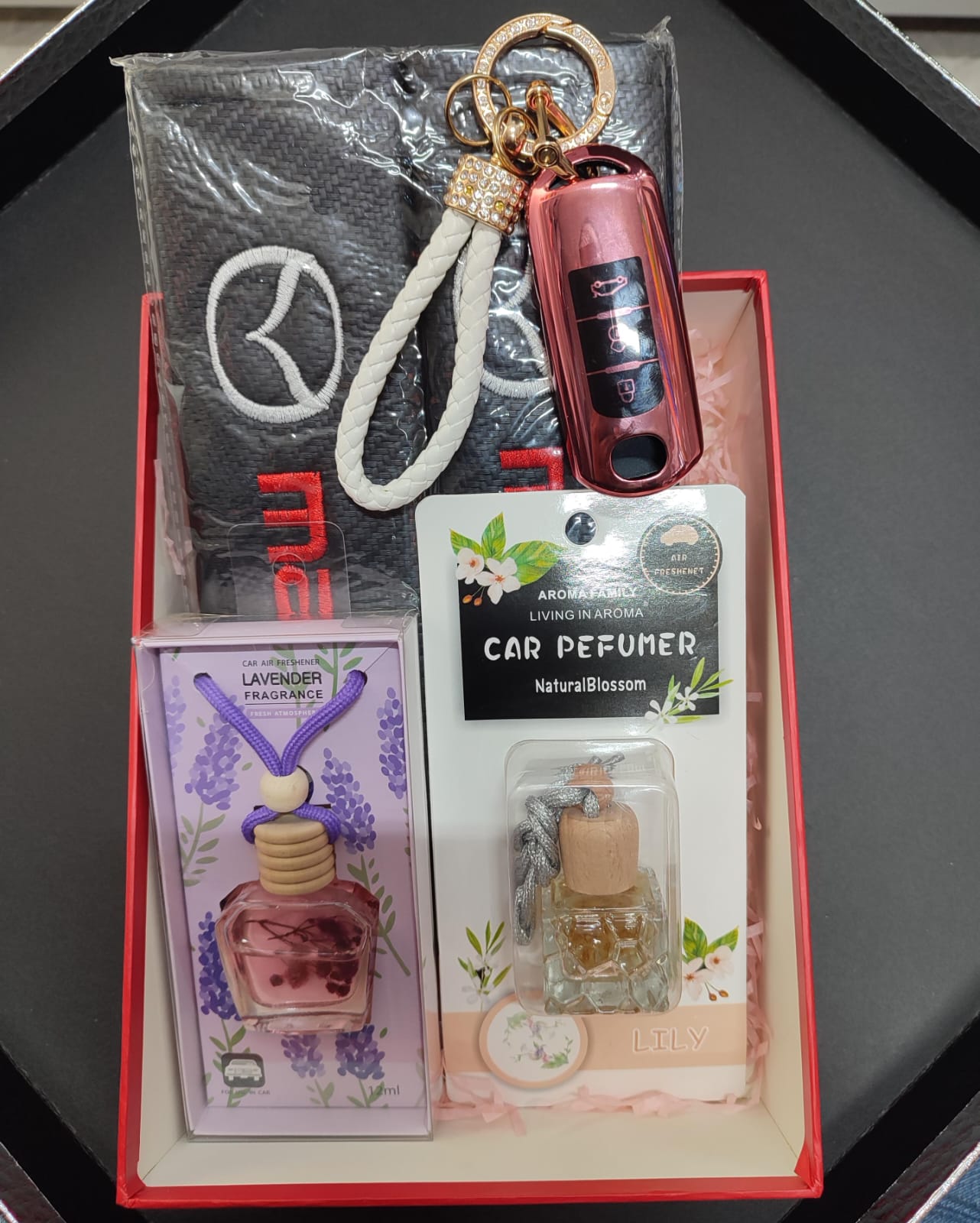 Package contains: 1 gift box. 1 pair of Mazda Seat belt Shoulder Pad Cover. 1 fob key cover. 1 Key holder strap. 2 car perfume. 1 free gift card.